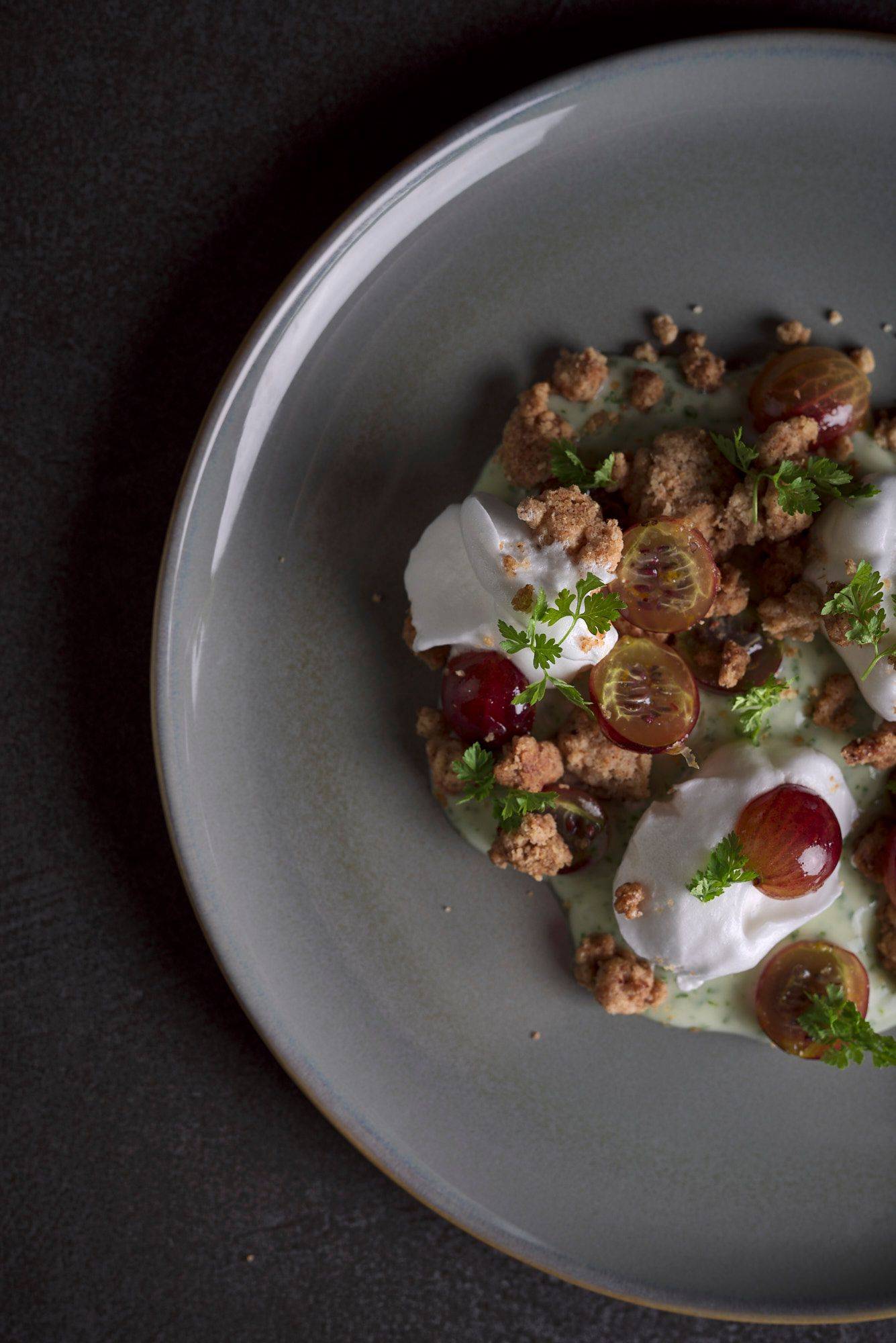 Gooseberry & Spelt Crumble with Chervil Custard